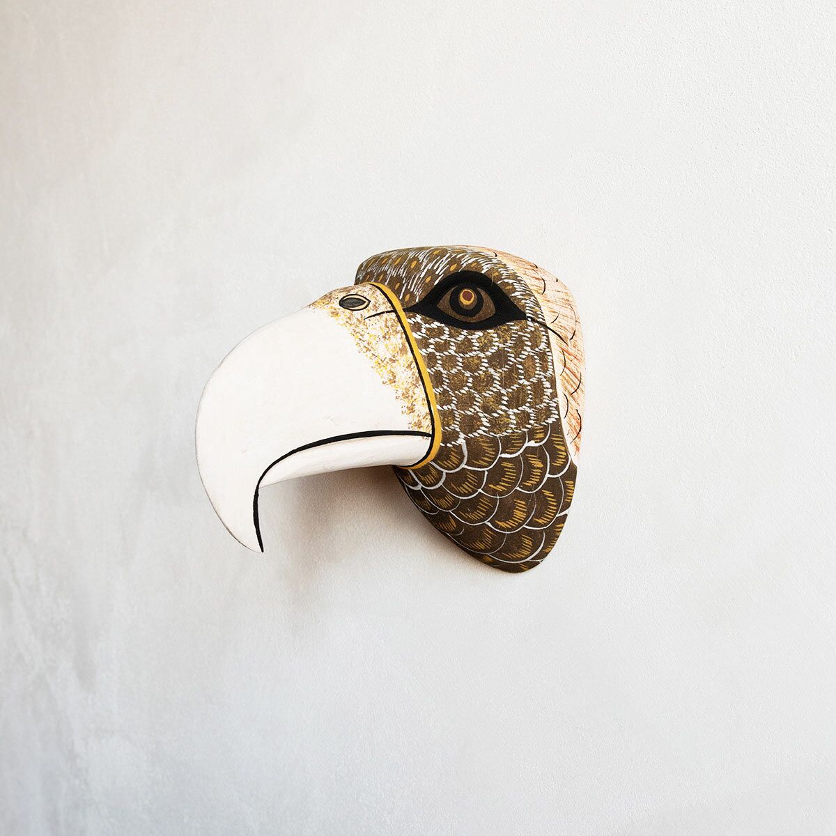 Ayant sillonné l’Argentine à la recherche d’un artisanat d’exception, nous sommes heureux de vous faire découvrir ici le savoir-faire des artisans Chané. Cette communauté maîtrise depuis des générations la sculpture sur bois. Des pièces uniques imaginées et façonnées de leurs mains expertes. Récolte du bois de Palo Borracho (arbre typique d’Amérique latine), modelage au couteau et enfin décor pictural naturel rythment leurs journées. Ils élaborent des têtes d’animaux en bois minutieusement travaillées. Selon la tradition, ils se portent lors de festivités. Aujourd’hui, ces objets au pouvoir hautement décoratif se faufilent jusqu’à chez nous pour une décoration murale remarquable et originale. Symbole de force et de majesté, ce masque Aigle en bois devient une pièce maîtresse de votre décoration. Exposez-le sur le mur de votre choix. Dans un séjour, une entrée ou bien une chambre, ce trophée mural trône fièrement en apportant de l’éclat et du caractère. Pour un tableau mural moderne et original, vous pouvez associer plusieurs têtes d’animaux en bois. En variant les modèles et les tailles, vous composez ainsi un portrait de famille atypique et exotique. Oiseaux, félins ou encore rongeurs se côtoient ainsi avec harmonie.