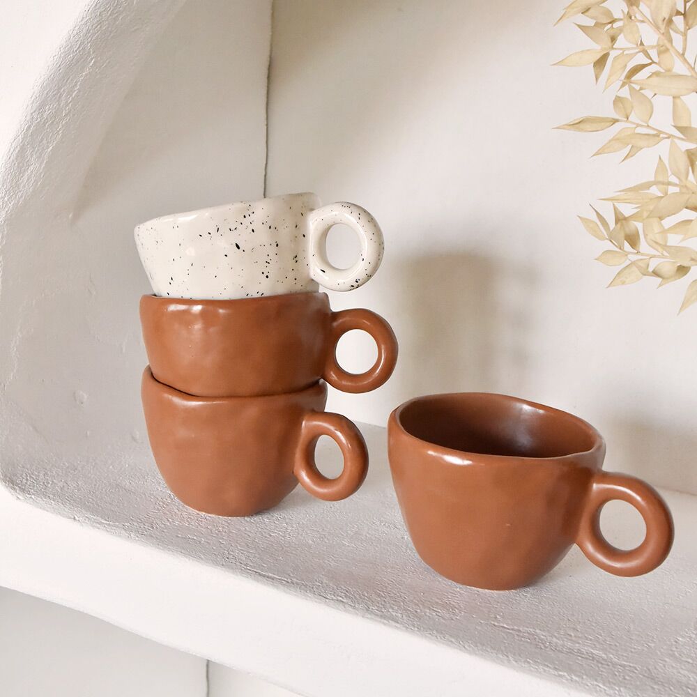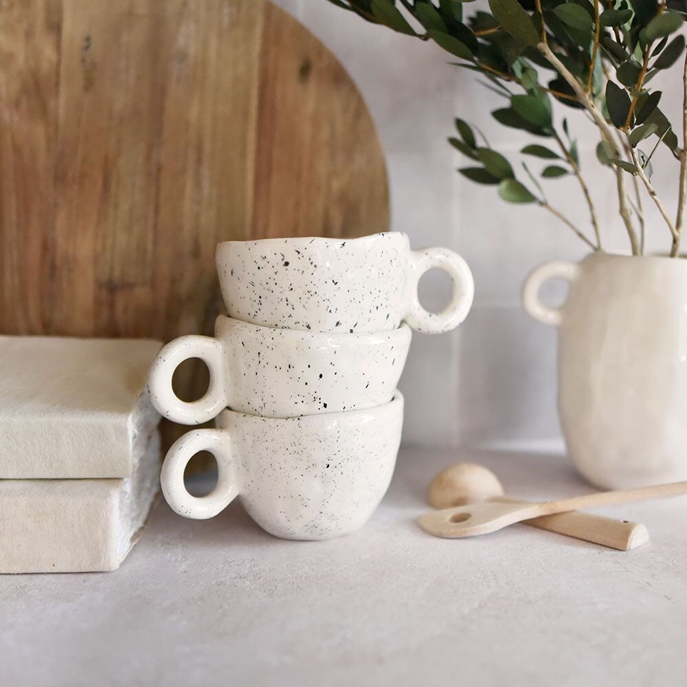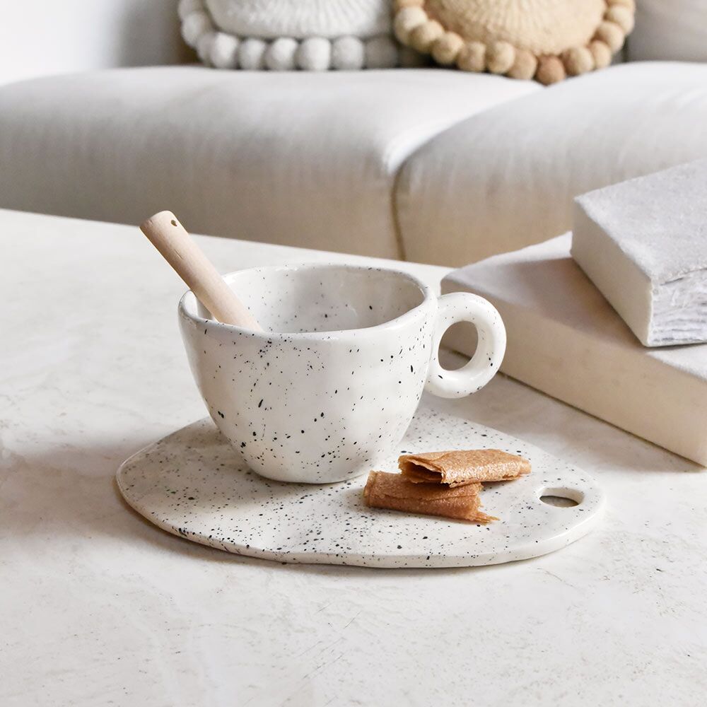 Toute notre sélection de céramiques artisanales est réalisée à la main par la créatrice Agustina Azlor. Basée à Buenos Aires, elle imagine et fabrique des pièces uniques au charme authentique. Formes rondes, couleurs et motifs sobres : son univers nous séduit et nous enchante. Cette tasse en céramique anses mouchetée vous accompagne au quotidien et décore avec élégance votre intérieur. Grâce à sa anse ronde, vous dégustez en toute sérénité vos boissons préférées. On craque pour son motif moucheté très tendance. Vous pouvez associer cette tasse en céramique avec une planche de dégustation de la même collection, pour des instants gourmands.