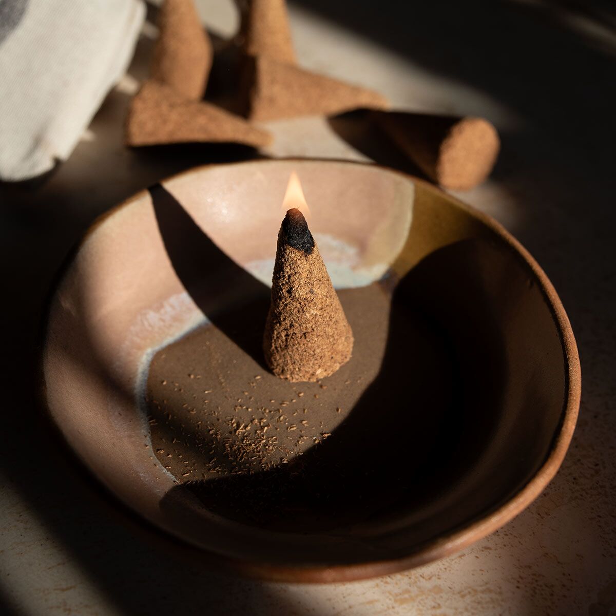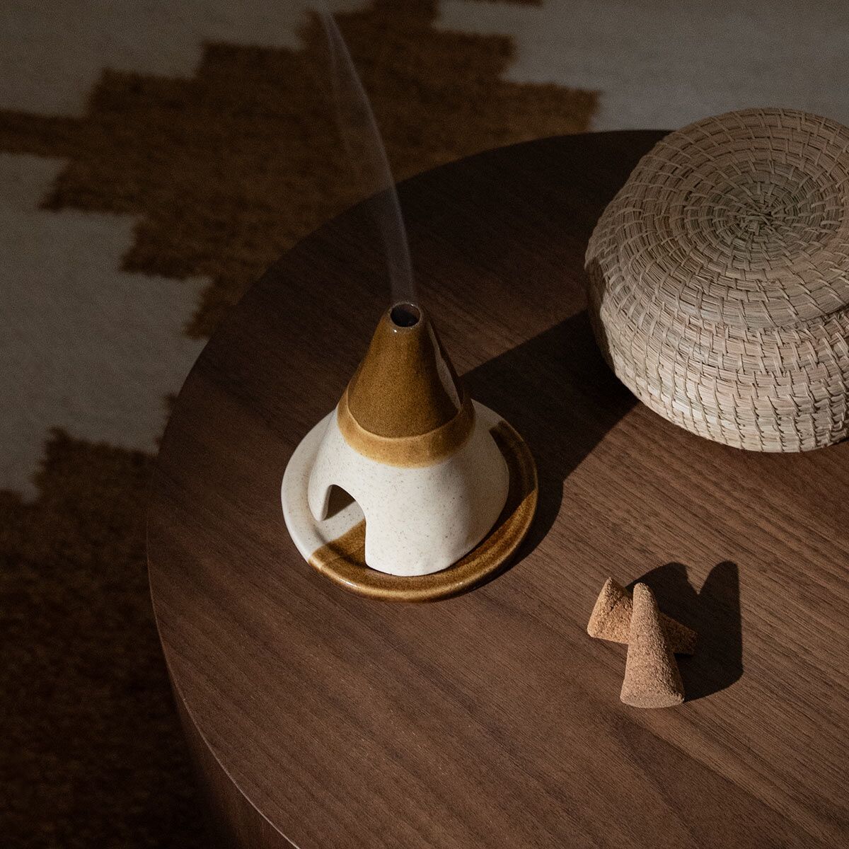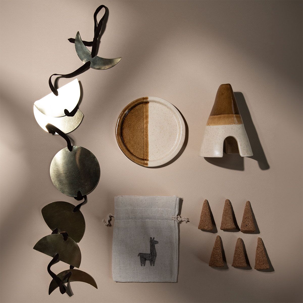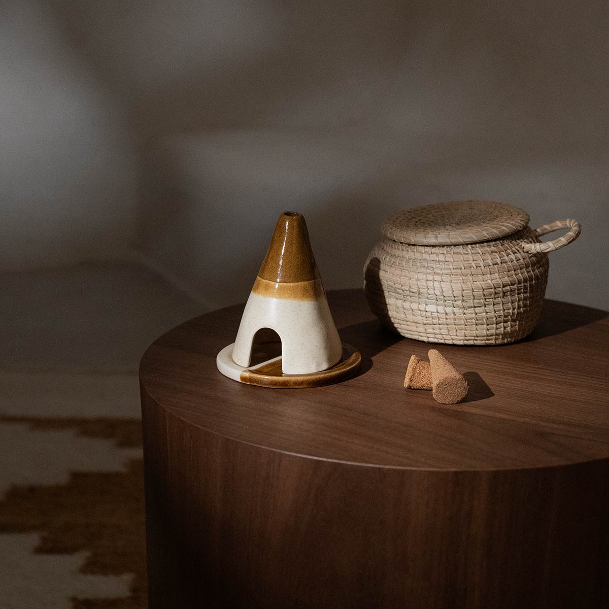 - 1 porte-encens : Réalisé à la main, ce porte-encens en forme de tipi est une pièce unique. Son design épuré et sa touche bohème en font un véritable objet de décoration, en plus d’un accessoire pratique pour brûler vos cônes d’encens en toute élégance.