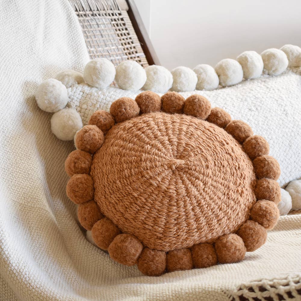 Dans un salon ou une chambre à coucher, ce mini coussin rond à pompons ocre est l’accessoire décoratif à adopter pour une ambiance cosy. De plus, ses pompons et sa forme ronde apportent beaucoup d’originalité. Vous pouvez le disposer aussi bien sur un canapé, un fauteuil ou encore un lit. Par son aspect moelleux, il donne à votre espace tout le confort dont vous avez besoin. Idéal pour des instants cocooning. On craque également pour sa teinte chaleureuse et naturelle. Aucun traitement chimique n’a été réalisé lors de sa confection. Ce coussin en laine est tissé artisanalement par nos partenaires situés dans le nord-ouest de l’Argentine. Il s’agit d’un modèle unique témoignant d’un savoir-faire ancestral. Pour parfaire votre décoration ethnique chic, découvrez l’ensemble de notre collection de coussins ethniques.